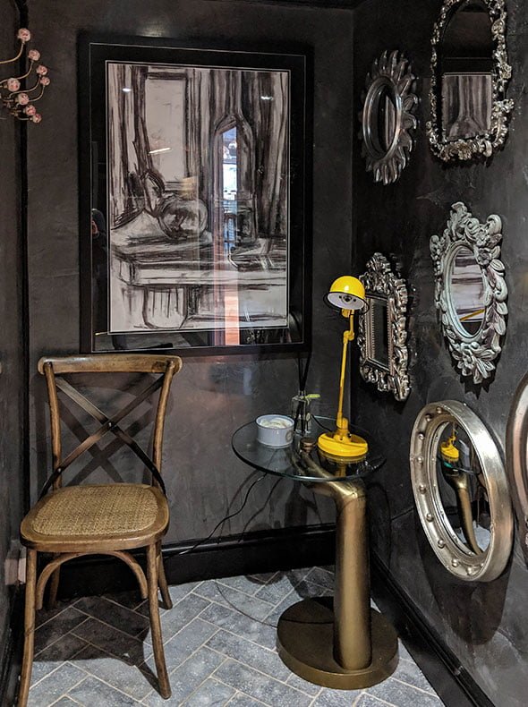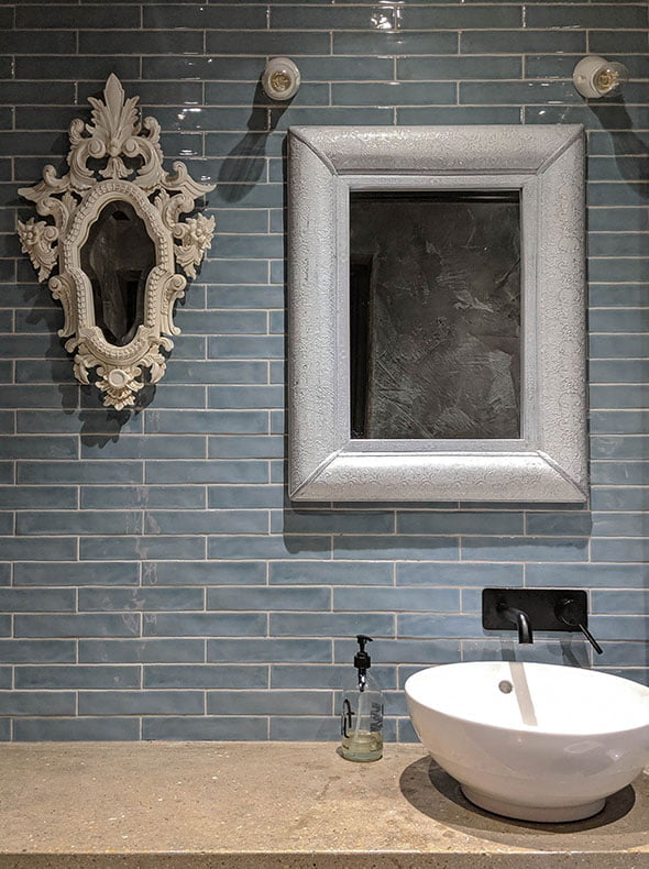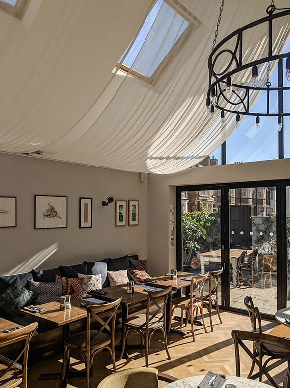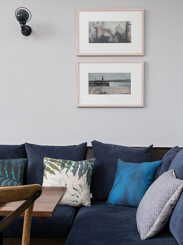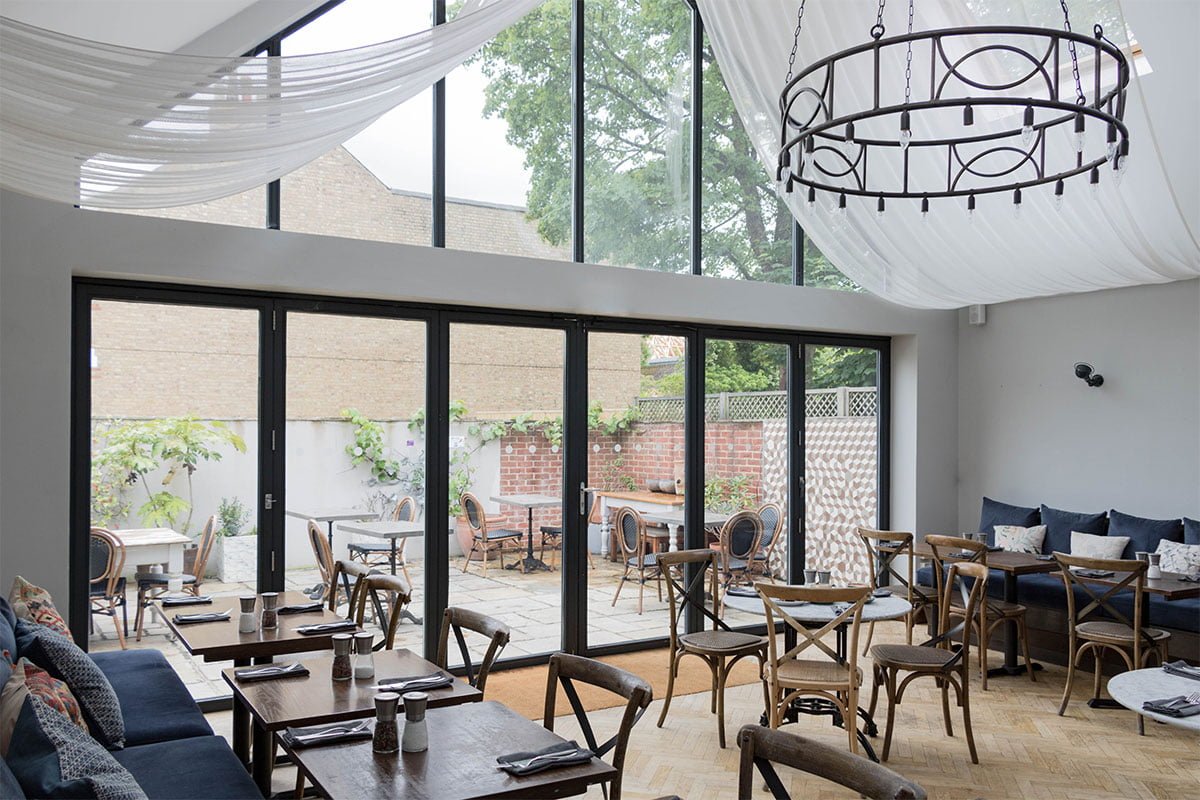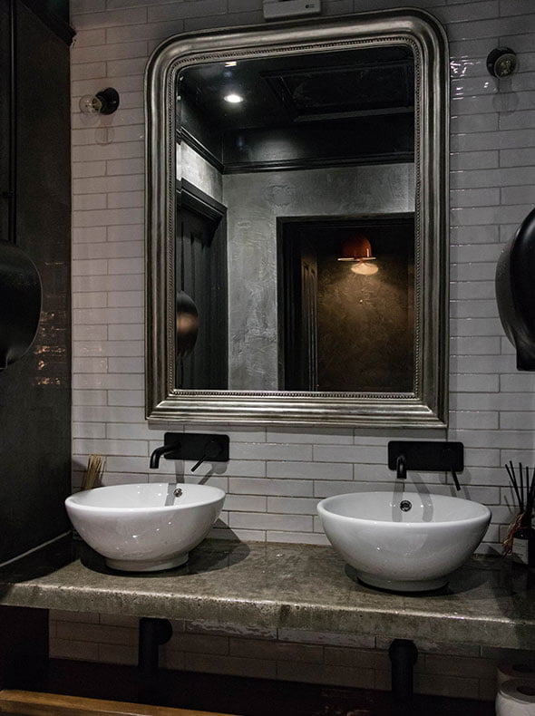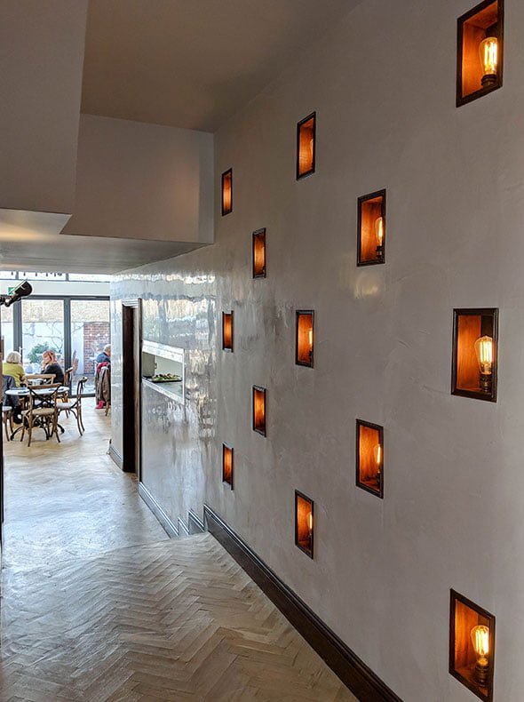 The colour palette was soft and light to reflect all of the natural light, particularly in the rear conservatory area which was to be used as a small art gallery for local artists. In contrast, we made the toilet area dark and textured with polished concrete vanity units and mock concrete floor tiles. Dark polished plaster was used in the bathroom lobby and WCs and light polished plaster in the corridor alongside, creating a real visual accent and a continuity to what otherwise would be a bland corridor. All the built-in furniture and shelving was designed to give the space character, along with the polished concrete bar top, tiled bar walls and fitted banquette seating.