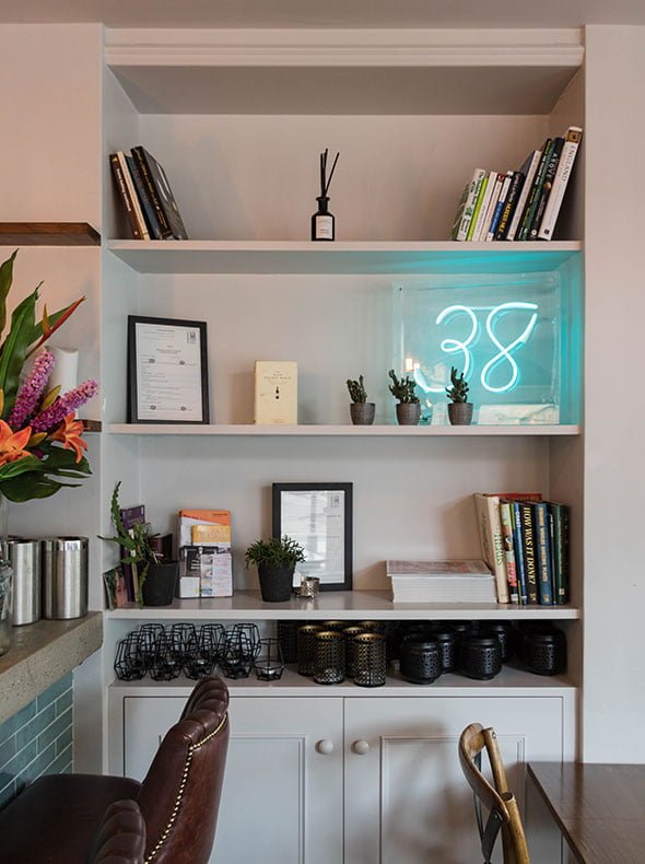 The existing old parquet floor was polished and sealed and reclaimed boards were sourced and fitted to sit alongside the existing. We designed a simple “38” neon sign for the shelves near the two fully glazed exterior walls to catch the eye of people passing by.